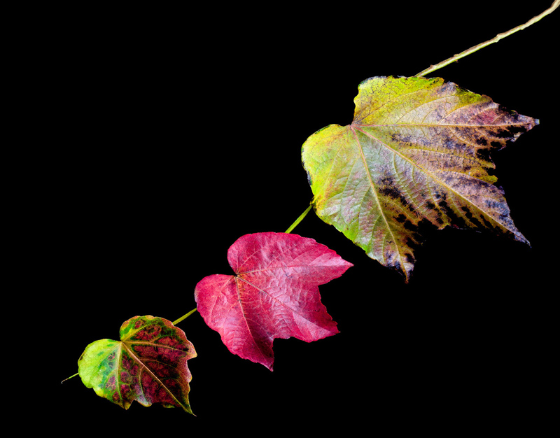 Les 3 feuilles ont été fixées sur une tige et photographiées sur un fonds noir