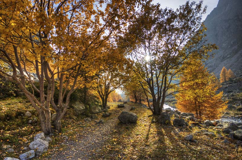 Chouette paysage en CJ avec de belles couleurs automnales presque un peu trop lumineux dans l'ensemble...? sinon juste la pierre coupée coin SO... et un petit personnage sur ce chemin pour le dynamisme et la touche de vie...?