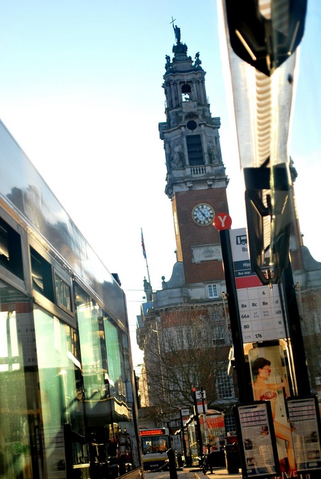 Ici pas de sol et un penché qui ne se justifie pas. Des éléments mais on se demande pourquoi tu les as placés de cette manière. On se retrouve coincé entre une vitre de bus, une grosse loupiotte de haut d'arrêt de bus (?je crois), et une cathédrale avec un Y collé à l'horloge...
