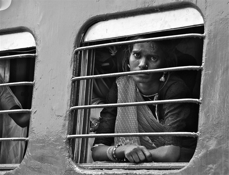 un regard intense bien capté à travers ces barreaux... mais de quel maux souffre-t-elle? sinon le cadrage je sais pas trop... le bras du rtype à gauche c'est pas top... peut-être essayer un carré en coupant un bout à gauche..? et nuancer davantage le NB comme ODL l'a dit...