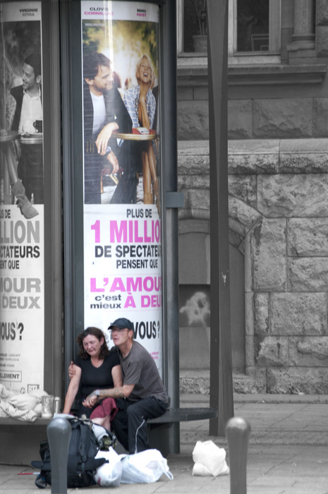 Quitte à traiter l'image de façon aussi poussée - je parle de la désaturation partielle - j'aurais un peu assombri les sacs pour qu'ils attirent moins l’œil...