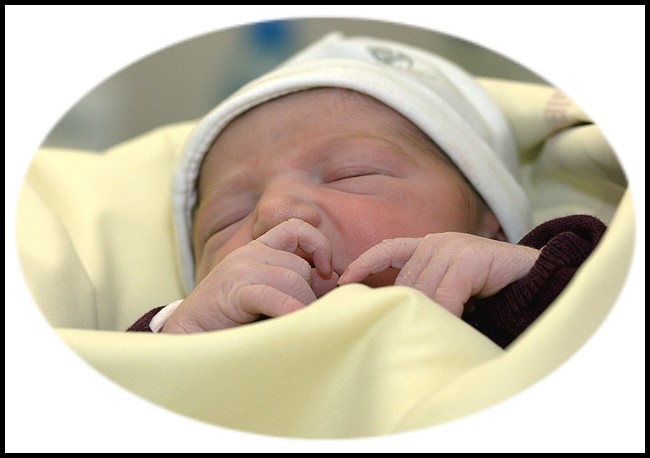 Un peu moins de louanges au photographe... Le visage du bébé est en partie caché par ses mains, elles-mêmes coupées par la couverture et je ne dis rien du cadre ovale...