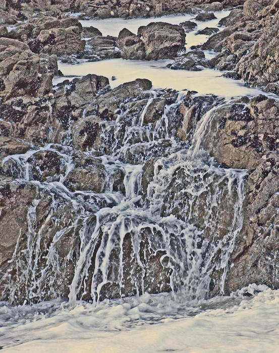en fait, une énorme vague s'est écrasée sur ce rocher et le reste de l'eau s'est écoulée en diverses chutes. Le traitement a été choisi pour en donner un aspect bizarre.