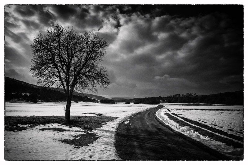 très ,très bien composée,en plus cet arbre est magnifique,le contraste neige bitume est très graphique,seul le ciel noir à droite me gênerait un peu