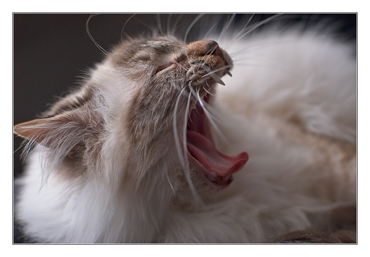 La gueule elle-même est un peu centrée dans le cadre, l'oreille et les moustaches sont coupées mais sinon, c'est bien vu et bien fait ! Instant bien saisi...