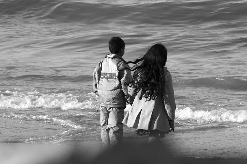 Avec ce truc flou devant ça fait vraiment photo volée, en plus de dos et centré Il aurait fallu ,au moins, que les deux gamins soit plus à gauche et qu'ils regardent quelque chose ou alors l'infini de la mer ....