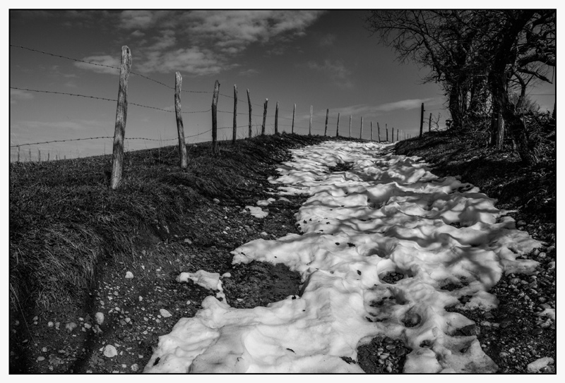 Un cadrage auquel j'adhère! une place de choix accordé à ce sol neigeux qui rend très bien à travers ce N&B savamment dosé.... point de fuite quasi sur point fort et cadre très joliment rempli! Bravo pour cette bonne photo!