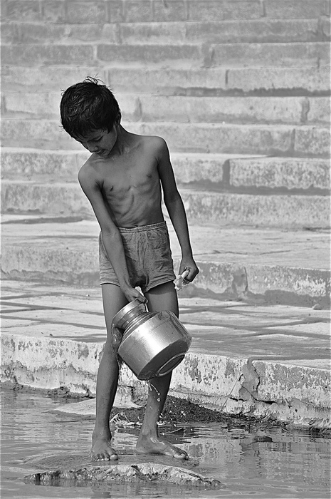 La photo fait partie d'une série, où le garçon vient chercher de l'eau pour remonter à son domicile plus haut.