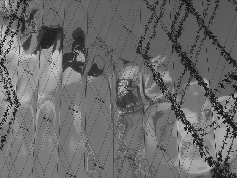 ici le reflet est plus confus et se noie dans le gris du ciel, de plus de nouveaux éléments (plantes grimpantes) ajoutent au mmanque de lisibilité