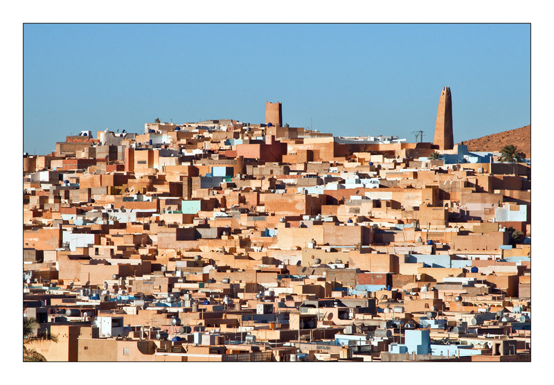 Le Ksar se trouve dans le sahara Algérien. La lumière est forte et contrasté. Le soleil n'est pas encore au zénith, il devait être 9h du matin. la structure de ce village m'a fait pensé à la peinture de Nicolas de Staël dans les formes et les applats. J'ai cherché à rendre plus la peinture que la photo. Pas de modélé uniquement des applats. Voici un autre traitement qui diffirencie juste un peux.